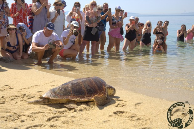 Ο ένας εθελοντής φορά μάσκα και πέδιλα και κολυμπά προς το λευκό σημάδι, καθώς εγώ παραμένω στην ακτή δείχνοντας συνεχώς με το δάχτυλο προς την χελώνα.