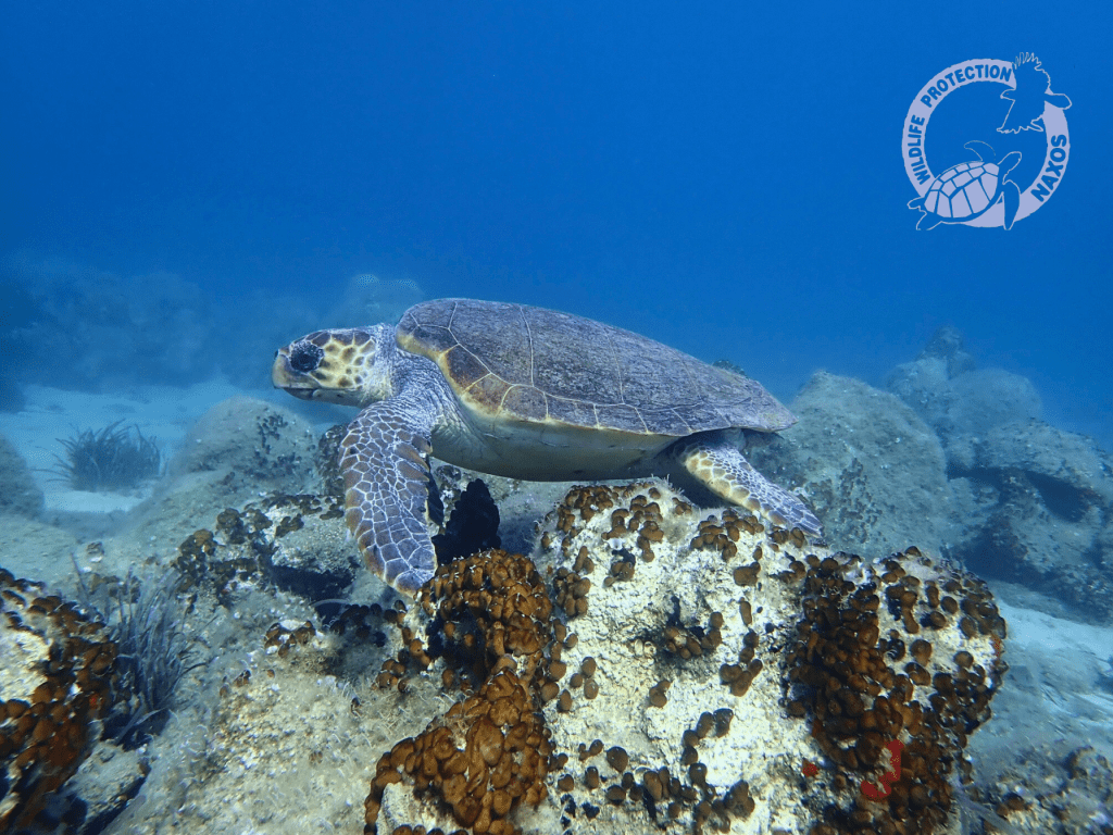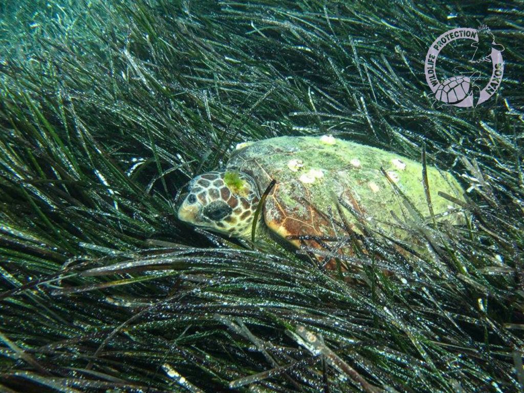 It was the 21st of July of 2017, when two volunteers of Naxos Wildlife Protection were snorkeling in the open water of Agia Anna and came across a sea turtle resting in a patch of seagrass. When the snorkelers approached her they noticed a wound on her head covered in algae and dived to check she was alright. The sea turtle started swimming but in a vertical position.