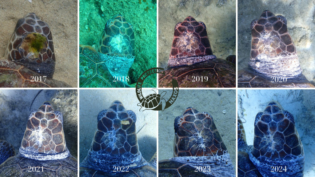 Such injuries take a while to heal, but according to our observations she behaves like a perfectly healthy sea turtle and is a joy to watch!